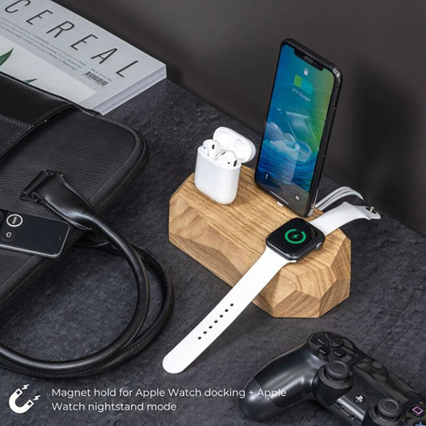 同製品はナチュラルで美しい木製の台座が目を引くポーランド製の木製充電ドッグ。机の上でもかさばらないコンパクトサイズでありながら、Lightningで2台まで充電でき、さらにApple Watchの充電も可能。手持ちのApple製品をまとめて充電できる便利な3in1ドックとなっている。