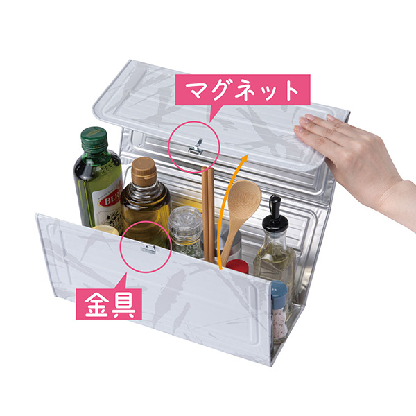 「調味料用さんかくハウス」は、調味料や調理器具を家のような見た目で汚れから守るアイテム。散らかって見えてしまいがちなキッチン道具を覆い隠すことで生活感が泣くなり、すっきりとした見た目になる。収納の高さは26cmまで対応しているので、塩や砂糖などの小物から油など背の高いものまでまとめて収納できる。マグネットと金具が付いているのできちんと開閉可能だ。