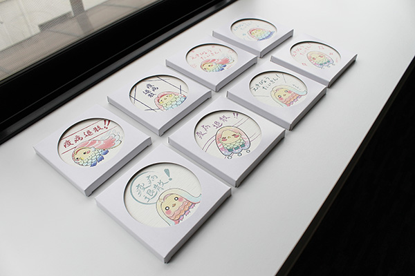 「アマビエ珪藻土コースター」はかわいいアマビエのイラストをあしらったコースター。珪藻土コースターなので、水分の吸収力が低下しても紙やすり等で薄く削り拭き取ることで、長く使用できる。風通しの良い場所で陰干しするとカビが発生しづらい。アマビエのイラストは全4種類で、「どっしり前向き」「いきいきHAPPY」「きらっと穏やか」「はきはき元気」があり、疫病退散の文字を漢字で書いたデザインとひらがなで書いたデザインがある。