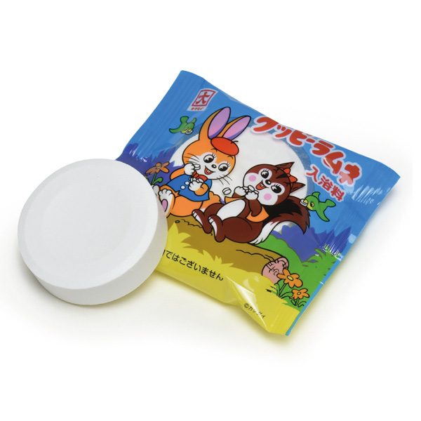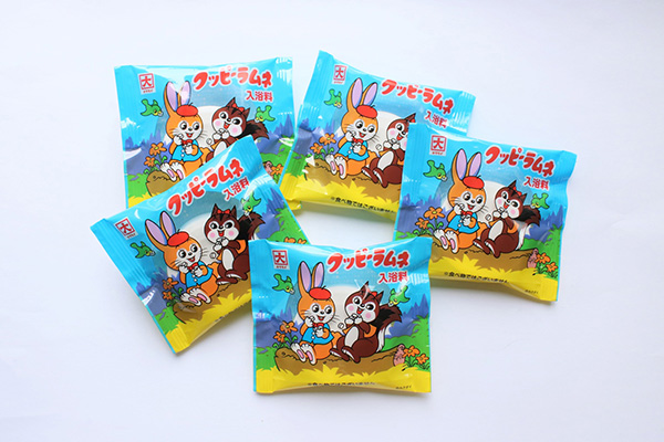 「クッピーラムネ入浴料」はラムネの香りをイメージした入浴料。ほのかな甘酸っぱい香りでラムネを表現している。袋のなかには大粒のクッピーラムネをひとつ封入。まるでお菓子を湯船に入れるような不思議な体験ができる。