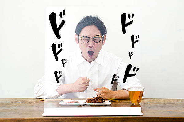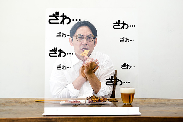 「まんがばん」は、漫画風の文字をあしらった透明アクリルパーテーション。「ドドドド ドドドド」や「ゴゴゴゴ ゴゴゴゴ」など、漫画で使われる効果音表現のようなデザインが特徴だ。カメラと参加者の間に置くだけで画面に文字が出現するので、難しい設定などは一切いらない。