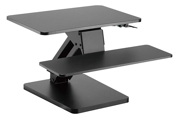 本製品は卓上タイプであるため、既存の机やテーブルを生かしたまま使える。レバーを握って簡単にデスクの高さを上げ下げでき、理想的な高さで止められる無段階での調整に対応。床に置いて座椅子などと組み合わせ、ローテーブルのように使うこともできる。