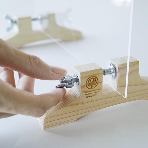 同製品は、半世紀にわたって神社へ奉納する木製品を製造してきた「フジセン」と、デザイナーとの協業によって生まれたクランプ式の木製スタンド。素材は浜松天竜産のヒノキ(FSC森林認証材)。台座が板を挟むクランプを兼ねており、用途に応じた板を組み合わせることで“欲しいサイズぴったり”のパーテーションをその場で作ることができるようになっている。