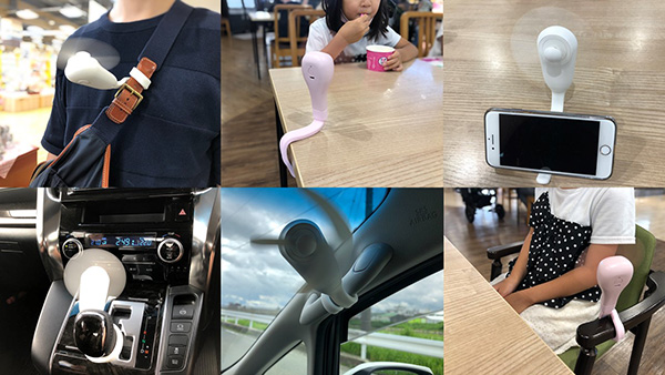 「くるピタファン」は巻き付き自由自在に設計された扇風機。日傘やショルダーなどに取り付けてアウトドアで利用できるだけでなく、デスクの天板や椅子の肘置きに取り付けるなどして屋内でも使うことができる。柄の部分は軽い力で自由な角度に変えられるフレキシブル仕様。操作は簡単ワンタッチ式で、弱風と強風を使い分け可能だ。また、赤く点灯する充電ランプを搭載しているので、充電状況がひと目でわかる。
