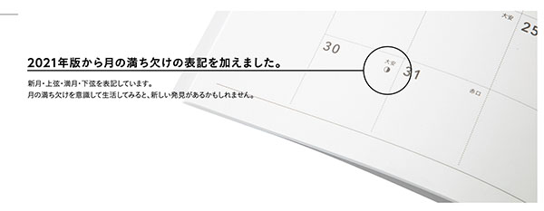 内部は、「ノートタイプ(A5/B6/A6)」「ハードカバータイプ(ホルダータイプ/Wリングタイプ)」ともに、一か月を一目で見渡せるマンスリータイプで、筆記スペースにゆとりを持たせたシンプルなデザイン。左端には、月間目標やToDoを書くのに便利なメモスペースを。右下には前後二か月のカレンダーを設け、2021年版からは、満ち欠けの表記も追加されている。