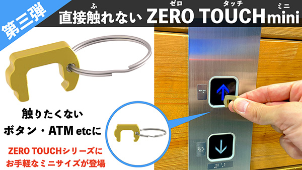 「ZEROタッチmini」はボタンやATMの接触をさけるミニサイズのツール。ZEROタッチシリーズの第三弾として登場する。指先サイズとなっているので持ち運びがわずらわしくなく、カギに取り付けておくこともできる。コの字型形状を基本として、ボタンなどを押しやすいよう膨らみを持たせているので、タッチパネルの操作だけでなく押しボタンやテンキー操作などに活用することが可能だ。