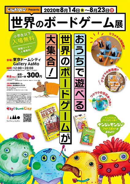 2020年8月14日(金)から8月23日(日)まで、東京ドームシティのGallery AaMo(ギャラリーアーモ)にて、「すごろくやpresents 世界のボードゲーム展」が開催される。家で遊べる世界の多彩なボードゲームが集まるイベント。ボードゲーム専門店「すごろくや」の企画協力のもとで開催される。会期中無休、時間は12:00〜20:00(入館は閉館30分前まで/物販コーナーは20:00まで)で、料金は300円(小学生以下は無料/物販コーナーは入場無料)。