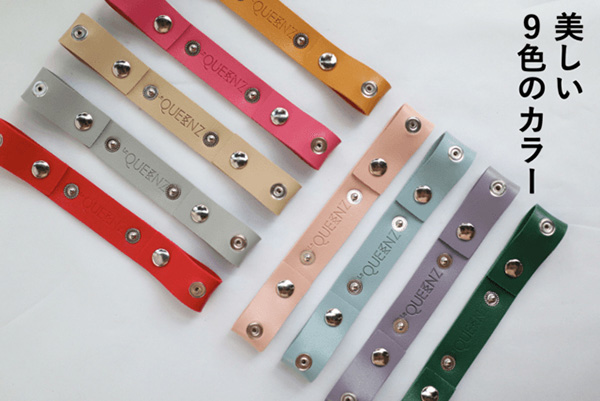 「マスクリング」のサイズは全長26cm×幅2cm。ボタンの位置で長さを調節でき、最長20.5cmで、最短14cmとなっている。カラーバリエーションは9色展開で、アイボリー、スカイブルー、ベビーピンク、パープル、イエロー、ホットピンク、レッド、グリーン、グレーを取り扱う。