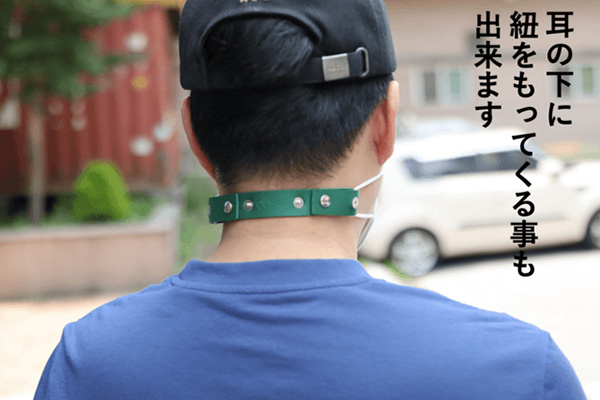 「マスクリング」は、マスク着用時の耳の辛さを和らげるアイデア製品。マスクの紐をリングで固定できるので、耳の下に紐が触れないようにしたり、耳の下に紐をもってきたりすることができる。使用しない際は首にかけてマスクホルダーになるので、マスクを一時的に保管する手間がかからない。革工房が製造しており、合成皮革とシルバーのボタンの配置がおしゃれに仕上がっている。汗や水に強い素材なので、夏でも快適に利用可能だ。
