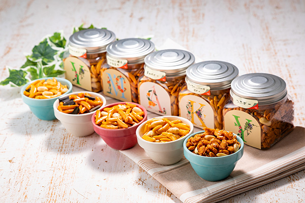 「北欧風イニシャルボトル菓子」は、北欧風イニシャルで上品さとかわいらしさを備えたパッケージ。柿の種やあられを詰めているので、年齢や性別を問わずに食べやすい。イニシャルは全部で4種類あり、「A」「K」「M」「Y」を取り扱う。日本人の名前に多いアルファベットを採用しているという。相手の名前を思い浮かべながら選ぶことができるので、心のこもったプレゼントに適したデザインだ。