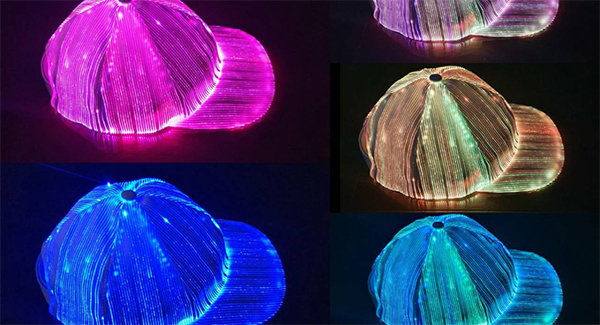 同製品は、LEDファイバーライトを内蔵し、スイッチ一つでレッド・グリーン・ブルー・イエロー・ピンク・ライトブルー・ライトパープルと7色の光を放つオーロラキャップ。