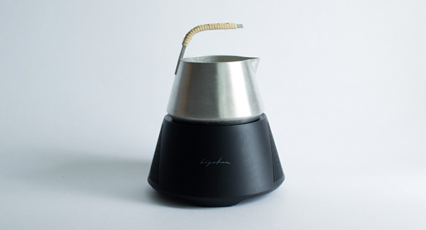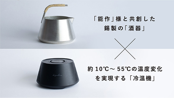 「hiyakan」は、加熱と冷却の両方を実現した冷温機。富士山をモチーフとしており、シンプルで力強いデザインに仕上がっている。錫の器は富山県高岡市の鋳物メーカー株式会社能作の職人による手作り。砂型を使用し、一点一点鋳造している。取手の籐は、職人の手巻き作業によるもの。「hiyakan」には温度計がついていないが、付属の呑み方メニューを参考にしながら温度変化による香りと味の移ろいを楽しむことができる。また、冷温機内部にセンサーを内蔵しており、温度の過剰な上昇を防ぐ。