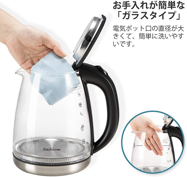 「Elechomes電気ケトル」は「早い」「きれい」「おしゃれ」にこだわった電気ケトル。ホウケイ酸ガラスによる耐久性と304ステンレススチールによる保温性を備えている。また、ガラス製なのでにおい移りがしづらく、中がよく見えて手入れがしやすいので衛生的だ。