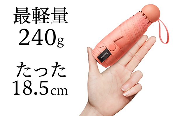 同製品は、重量240g、畳んだ時の長さはわずか18.5cmという最小・最軽量な折り畳み傘。本体と同色の便利な収納ケースがついており、定番カラーから可愛いパステルカラー、落ち着いたモノトーンまで全12色をラインナップ。男性から女性、子供までピッタリの一色を選ぶことができる。
