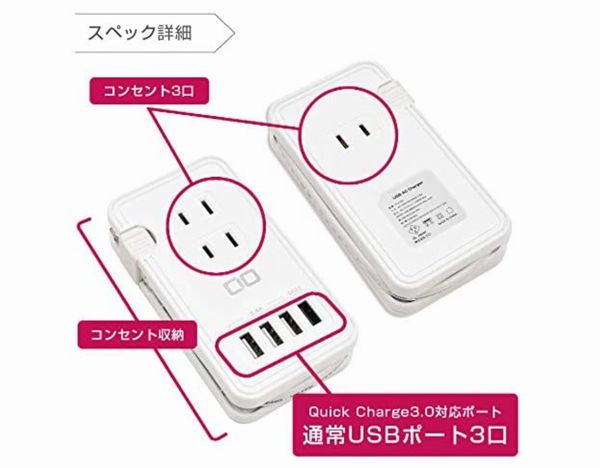 充電能力はQuickCharge3.0(QC3.0)に対応し、GalaxyやXperia等の急速充電ができる。また、iPhone/iPadも2.4Aの急速充電が可能。全ポート合計で最大5.4A出力可能なハイスペックポートを搭載する。
