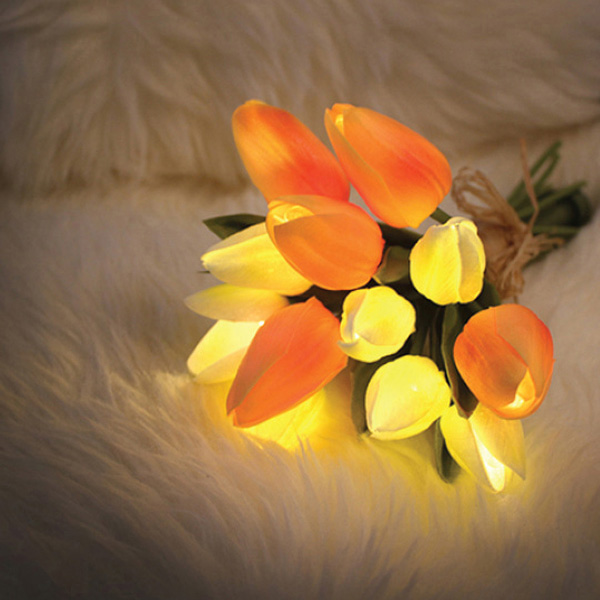 「チューリップブーケLED」は、部屋をおしゃれに照らすLEDライト。スイッチを入れると点灯する装飾用照明だ。電池で動くポータブル式なので、ベッドサイドや玄関などコンセントがない場所でも利用できる。花はひとつずつ手作りされた本物のような仕上がり。