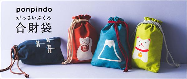 身のまわりのものを一切合財放り込んで持ち歩けることから名づけられた「合財袋」は、既存のとんぼ柄に加え「招き猫」「戌」「富士山」の3柄を新たに追加。ポーチとして、バッグinバッグとして、そのまま手提げとしてなどさまざま用途で活躍する便利でキュートな製品となっている。