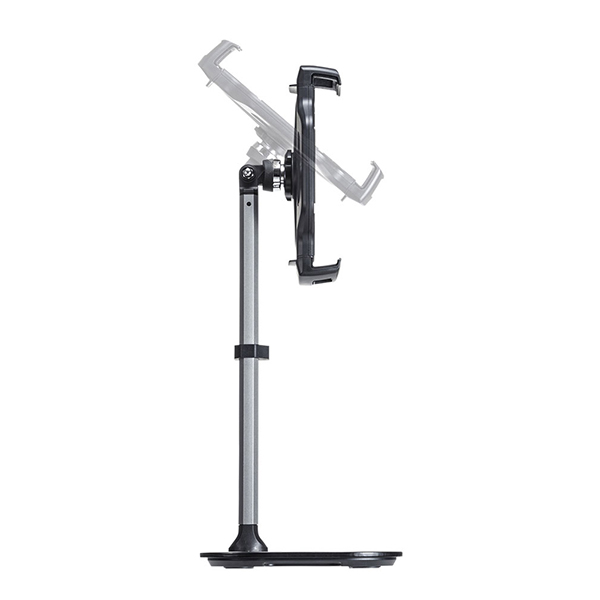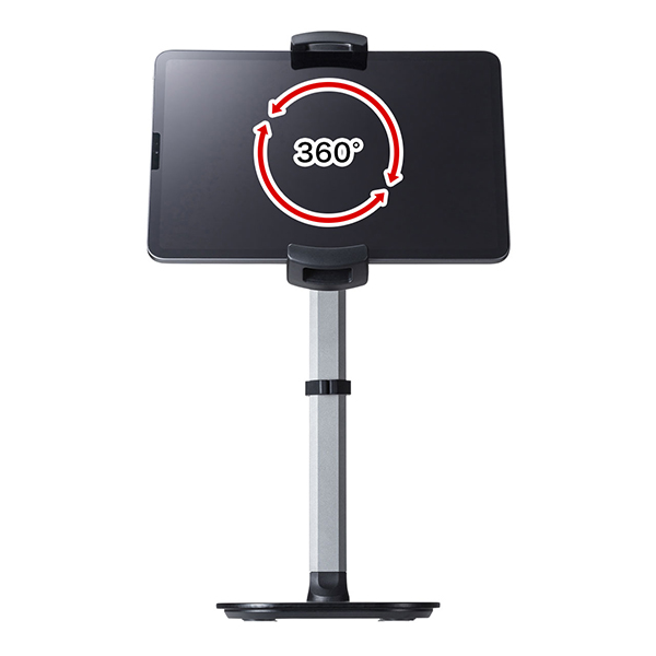 同製品は、伸縮アームでタブレットの高さを調節できる便利なタブレットスタンド。ホールド部分は360度回転式。デバイスの向きも調節できるようになっているので、さまざまな用途において、最適な位置にデバイスを固定することができる。