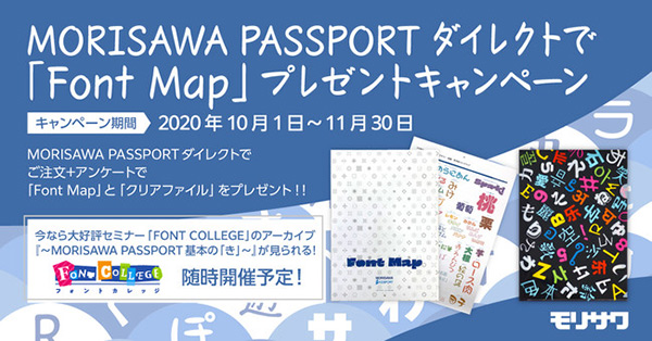 株式会社モリサワは、2020年10月1日(木)から11月30日(月)まで、“MORISAWA PASSPORTダイレクトで「Font Map」プレゼントキャンペーン”を実施している。キャンペーン期間中に「MORISAWA PASSPORTダイレクト」で、新規・更新・台数追加のいずれかの注文を行い、さらに応募フォームからアンケートに答えたユーザーが対象。もれなくプレゼントを受け取ることができる。