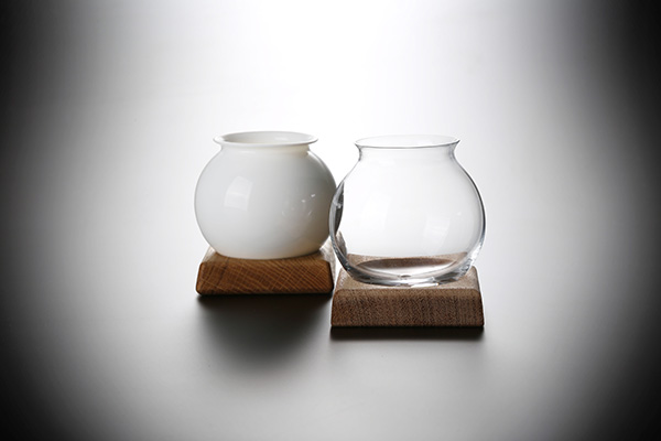 「天頂」は、日本酒の香りを引き出す球体が特徴の器。口元が開いているので、ちょうどよい量の香りが口の中に広がる。口元の薄さは1mm程度で、繊細な味わいを感じやすくなっている。球体を採用することで、香りを最大限に引き出し調和させるだけでなく、スワリングにより香りが引き立ちやすい。また、付属の木製台座に置くことで、球体の美しさを強調する。ガラスだけでなく、ぬる燗や熱燗を楽しみやすい磁器も取り扱う。