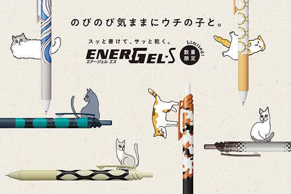 6種の猫をデザインしたゲルインキボールペン「エナージェル エス 限定ねこ柄」。ぺんてるより