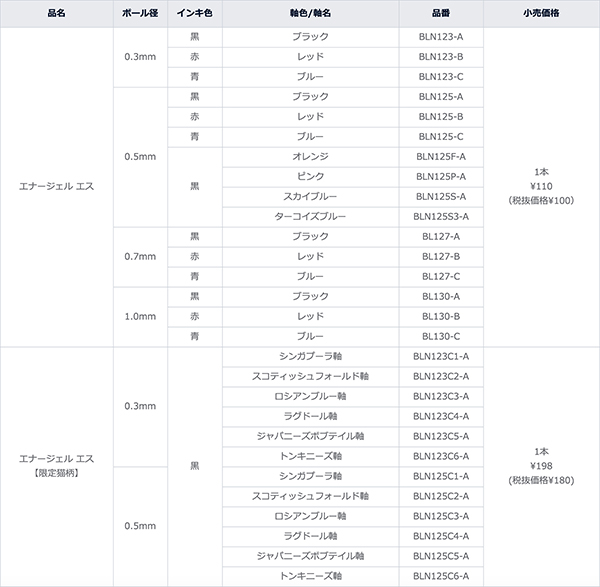 ぺんてる株式会社は、10月6日、同社のゲルインキボールペン「エナージェル」シリーズより、シンプルな中にもデザイン性を追求した「エナージェル エス」ベーシックモデルと、6種の猫をデザインに落とし込んだ「エナージェル エス 限定ねこ柄」を発売すると発表した。