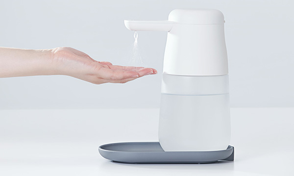 「TE1000」は、手をかざすだけでアルコール消毒液を噴射する自動手指消毒器。直接機械に手を触れずに消毒できるので、衛生的だ。従来品の「テッテ」TE500は容量が0.5リットルだったが、本製品では1リットルとなっており、消毒液を詰め替える手間を半減する。透明ボトルデザインなので、消毒液の残量が確認しやすい。「手をかざしてかんたん消毒」と書かれた付属のメッセージパネルは日本語だけでなく、英語、中国語、韓国語の3カ国語表記となっており、会社の受付や店舗で使用を促したい場面で役立つ。