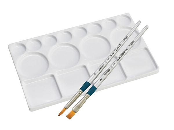 ホルベインのロングセラー商品であるパレットと筆のセット。デザインパレットには実際の商品と同様にパッケージ袋が付属し、店頭で販売されている状況が再現されている。水彩用筆・画筆3100H/Rは、穂先に向かってグラデーション塗装を施し、柄の先端に向かって細くなる形状も忠実に再現。