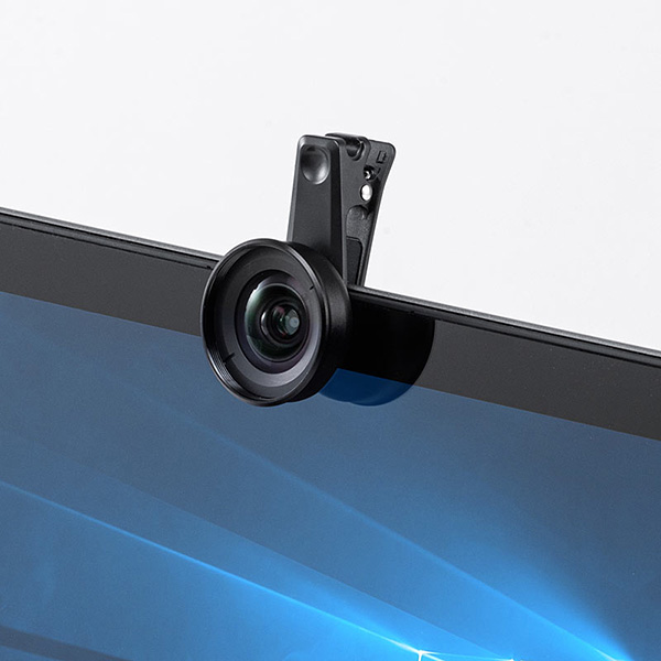 「400-CAM081」はカメラの視野角を110度まで広げられるアイテム。パソコンの内蔵カメラに取り付けるだけで画角が広がり、広い範囲を映すことができる。一般的な内蔵カメラの画角は80度ほどなので、3人以上映ろうとすると見切れてしまうが、110度に広げることで、3人以上でも十分に映すことが可能だ。クリップタイプとなっており、挟み込むだけで取り付けできるので、手軽に使用できる。