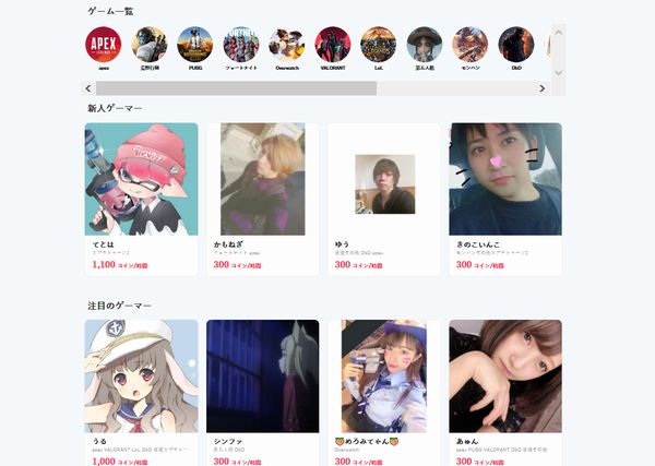 募集しているゲーマーは『注目のゲーマー・プロチーム所属 / コーチング・新人ゲーマー』などに分かれ、「ビジュアルが気に入った人とゲームを楽しみたい」「上手い人に教わりながらゲームしたい」「英会話でゲームしたい」などといった希望を叶えることができる。
