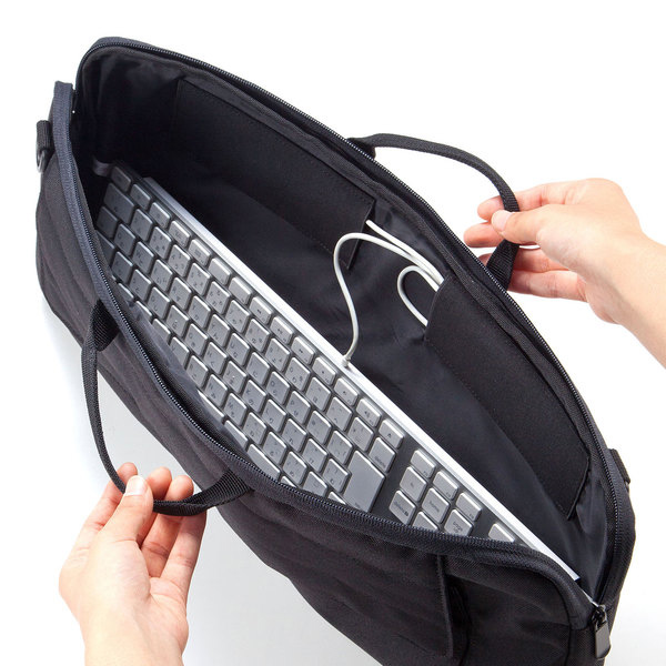 本商品は、型崩れしにくい張りのある生地と、しっかりしたクッションを採用しているバッグだ。最大で460(幅)×190(高さ)×40(奥行)mmまでのキーボードの収納に対応。内部にコネクタ用のポケットが用意されており、持ち運びの際にキーボードとコネクタの接触で傷が付くことを防止できる。また、本体外側にもポケットを用意。そちらにはマウスやケーブルなどの周辺機器を、一緒に収納できる。