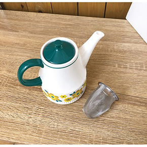 本製品のサイズはティーポットが100×176×H150mmで、マグカップが77×106×H73mm。素材は陶製となっている。マグカップはスタッキングが出来る仕様となっており、収納しやすい。ティーポットはステンレス茶こしが付属する。