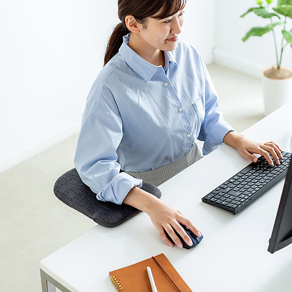 「100-TOK007BK」は、ワンタッチ取り付けができて手軽に使えるアイテム。クランプやネジ止めを使わないので、簡単に取り付けることができる。取り外しもすぐにできるので、左右の設置を変えたり微調整したりするのが手軽な設計となっている。リストレストやアームレストとして使うだけでなく、小物を置いておくことや、マウスパッドを置いてマウステーブルとして使うこともできる。