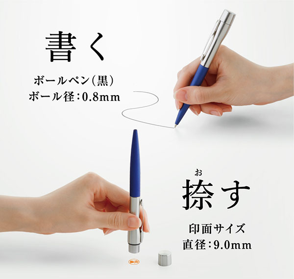 同製品は、シヤチハタのネーム印と高級筆記具の伝統ブランド「PARKER(パーカー)」の油性ボールペン(黒)がタッグを組んだ高級感のあるネームペン。マットな落ち着いた質感に、「パーカー」のシンボルである矢羽クリップが映える、スマートなフォルムが魅力である。