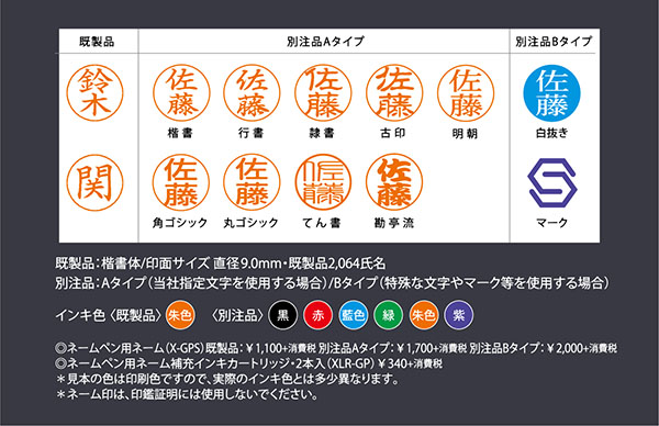 印面は豊富な既製印とオリジナルで作れる別注印タイプ(Aタイプ/Bタイプ)から選ぶことができ、別注印タイプでは行書、隷書、てん書、古印風などの文字が選べるほか、白抜き文字やマークにも対応。また、インク色も一般的な朱色のほか、黒、赤、藍色、緑、紫などのアレンジを加えることができる。