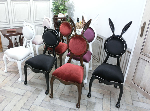 台座の部分は全て天然木を使った手掘り彫刻で、キュートな耳・尻尾がおとぎの国のようなアンティークで夢のある世界観を演出する。キャットチェアは、愛らしい猫耳と背もたれの隙間からのぞく尻尾がポイント。ラビットチェアは、特徴的な耳が目を惹くデザインだ。