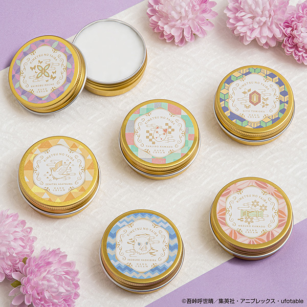 かわいい缶入りのハンドクリーム。炭治郎は背負っている箱をイメージしたひのきの香り、禰豆子はふんわり香るピーチの香り、善逸はすっきりとしたゆずの香り、伊之助はホワホワしちゃう?しゃぼんの香り、義勇はすっきりとしたソーダの香り、しのぶは華やかなブルーベリーの香り。