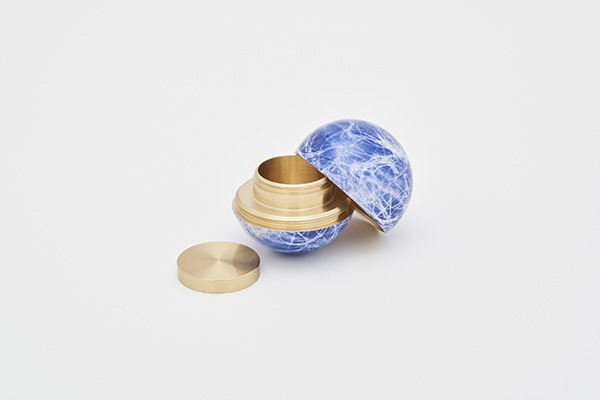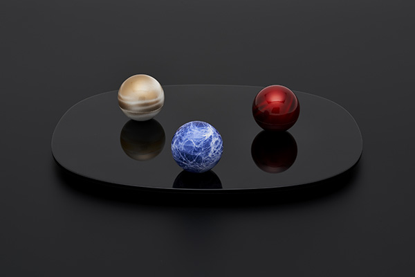 「こころぼし」は、新しい着色表現のミニ骨壺。高岡銅器の技術でつくられた「こころづき」に続く、手元供養の需要にこたえる製品だ。宇宙空間に浮かぶ太陽系の惑星をイメージしており、神秘的な美しさに仕上がっている。手仕事による着色技法なので、同じ星であっても、一つずつ表情が異なる。