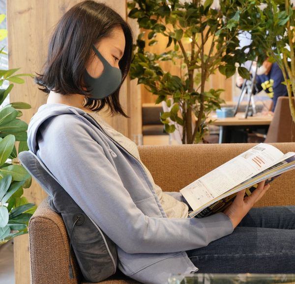 クッションは付属ゴムで固定できる他、ゴムを外して持ち歩き、背もたれが低いイスなど、様々な場所で使うことができる。