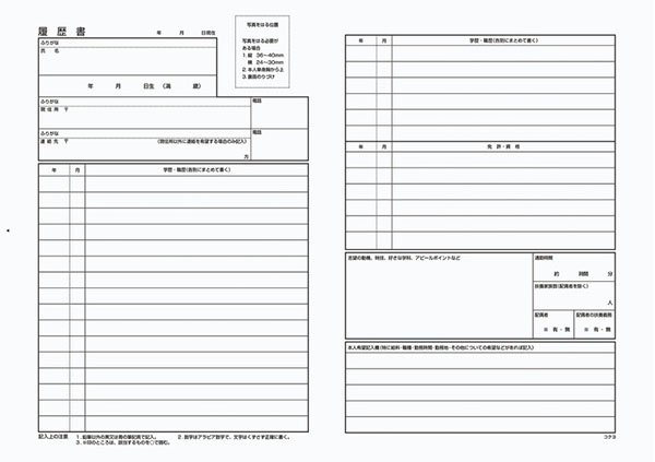 今回発売されるのは、B5判(のりのいらない粘着テープ付きの小型封筒3枚付き)、A4判(履歴書を折りたたまずに封入できる大型封筒3枚付き)の2品番で、いずれもJIS旧様式例から性別欄を除いた仕様になっている。