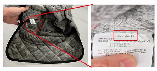 対象は、おひとりさま用着るこたつ(型番:TKWKOHK3)、カラーはグレー(灰色)で、型番は製品内側にあるラベルでチェックできる。