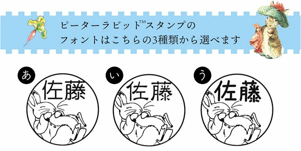 「ピーターラビット(TM)もちものスタンプ」は、お気に入りのキャラクターと好きな名前でつくれるオーダーメイドアイテム。特殊なインクにより、布やプラスチック、ビニールや金属、木材などに使用することができる。イラストはいたずら好きなピーターや従兄のベンジャミン、こねこのトムなど、全部で22種類。フォントは3種類あり、漢字3文字・ひらがなカタカナ5文字、アルファベット6文字以内に対応している。