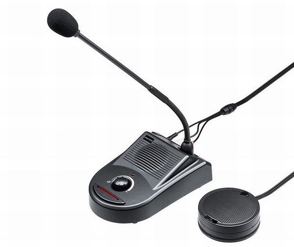 配線工事は不要で、スタッフ側に置くスピーカー付きスタンドマイク(親機)とお客さん側に置く、マイク付き小型スピーカー(子機)を設置すれば、双方でマイクスピーカーを使って会話ができる。
