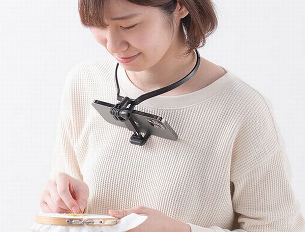 あごから少し下の位置でスマホを固定することができ、料理やイラスト制作、裁縫などの作業を両手フリーにでき、映像は人間の目線と同じものが撮れる。