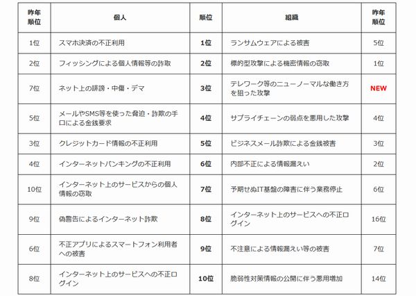 個人部門では2年連続で「スマホ決済の不正利用」「フィッシングによる個人情報等の詐取」のワンツーフィニッシュとなった。