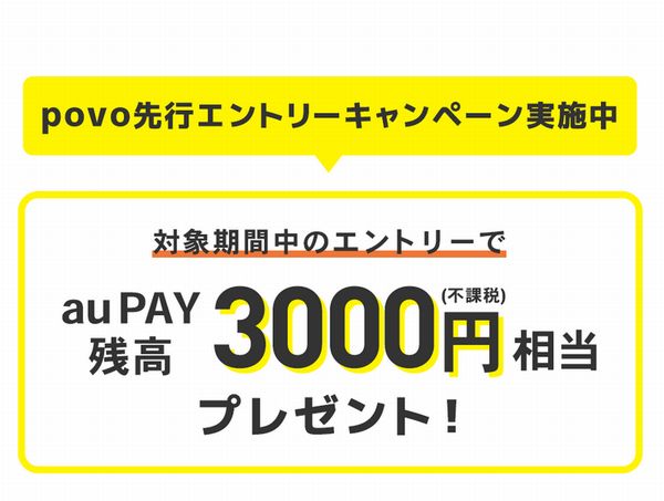 サービスの提供開始は3月予定で、事前申し込みして2021年5月31日までにpovoを契約すると、3,000円相当のau PAY残高をプレゼントする「povo先行エントリーキャンペーン」も実施される。