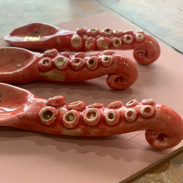 本製品はシーフードを食べるときに使いたい陶器のスプーン。タコやウツボ、イカゲソを模して制作されている。手がけたクリエイターの田川亞希さんは、武蔵野美術大学を卒業後、ロンドンのMaze Hill Potteryで活動し、現在は東京で活動している。ユーモア溢れる世界観を、丁寧に一つずつ手作りで仕上げる。