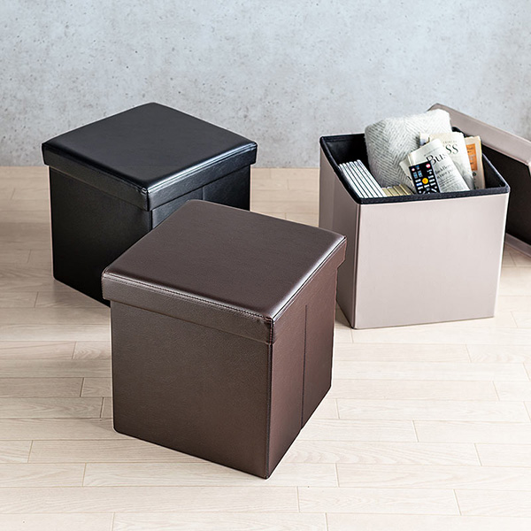 本製品は1台3役をこなせるPUレザータイプの収納スツール。座るだけでなく、収納したり、足置きにしたりと、使い分けができる。中に物を収納しない場合は、コンパクトに折りたためるので、スペースを取らずに保管可能だ。中はA4サイズのファイルが余裕を持って入る大きさなので、新聞や雑誌などを収納できる。ソファと組み合わせてオットマンとして使うことも可能。