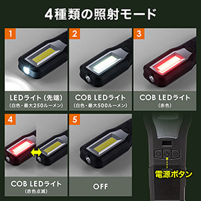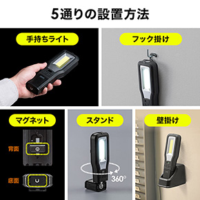 「800-LED041」は、4種類の照射が可能なクレードル式LEDライト。LEDは先端と面発光が可能で、電源ボタンを押すことで、白色(先端)・白色(前面)・赤色(前面)・赤色点滅(前面)の4種類のモードに切替可能だ。5パターンの設置が可能で、手持ち、フック、マグネット、スタンド、壁掛に対応している。明るさ調整ボタンを使うことで、ライトの明るさや、赤色点滅の速度を変更できる。