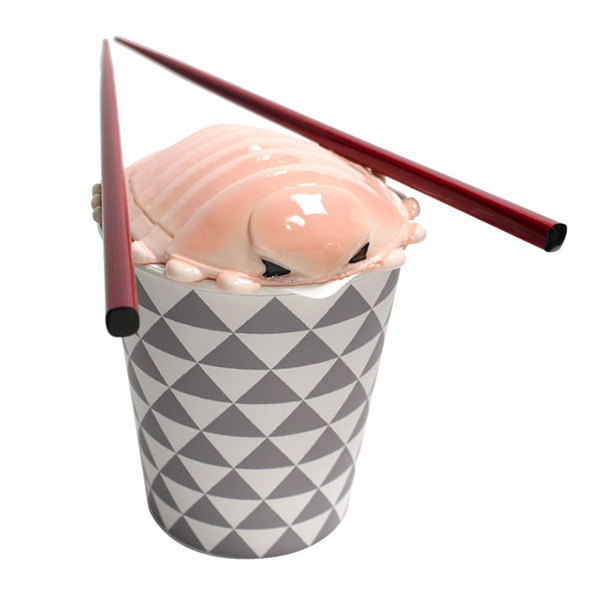 「カップグソクムシ」はカップ麺の紙フタの代わりに、容器をふさいでくれるキッチングッズ。「カップメンダコ」シリーズの新たな深海生物として仲間入り。主に前の3対6本の脚でふさぐ仕組みとなっている。フタとしてだけでなく、脚部分に箸を置くこともできる。カップ麺だけでなく、マグカップやコップのフタとしても利用可能だ。実際にダイオウグソクムシの生体に触れ、写真を参考にすることで、本物のような色に仕上げている。